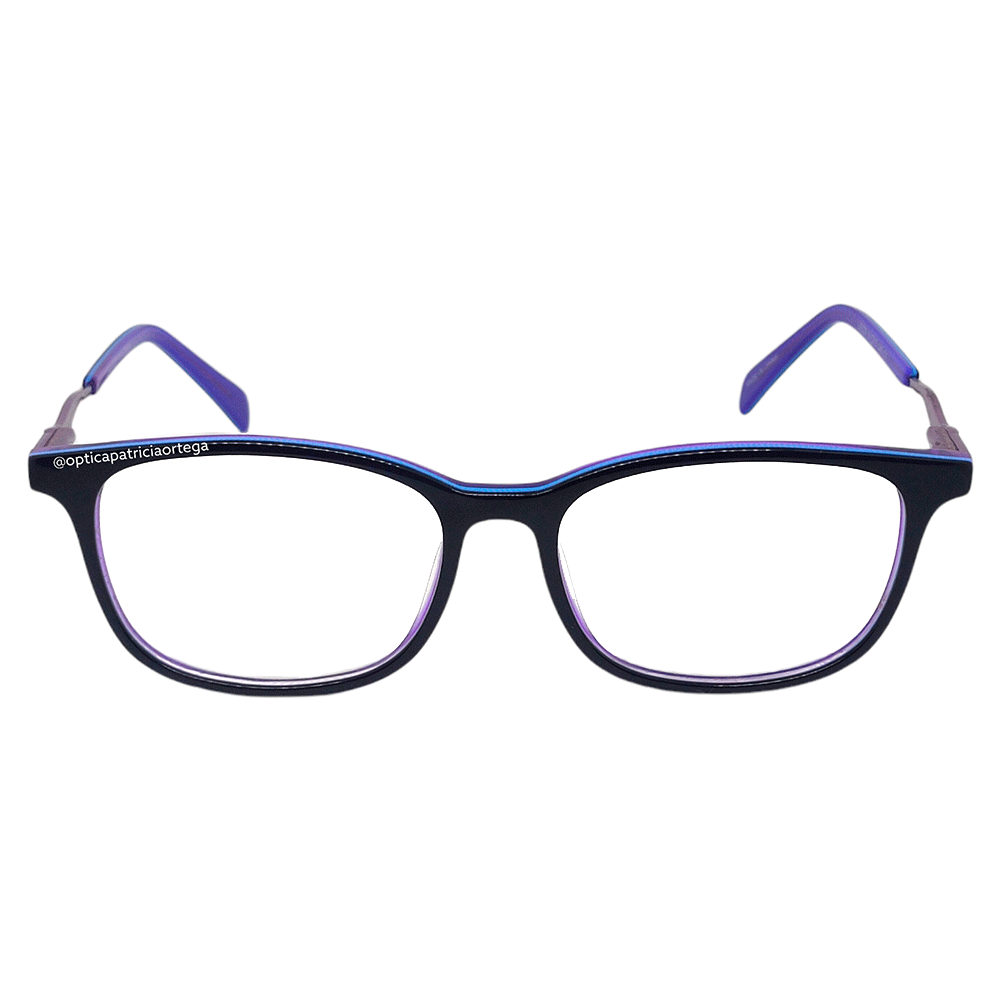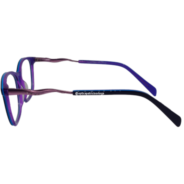 Gafas moradas con frente y parte de varilla negro, rayas azules, varilla con piedras al comenzando la varilla