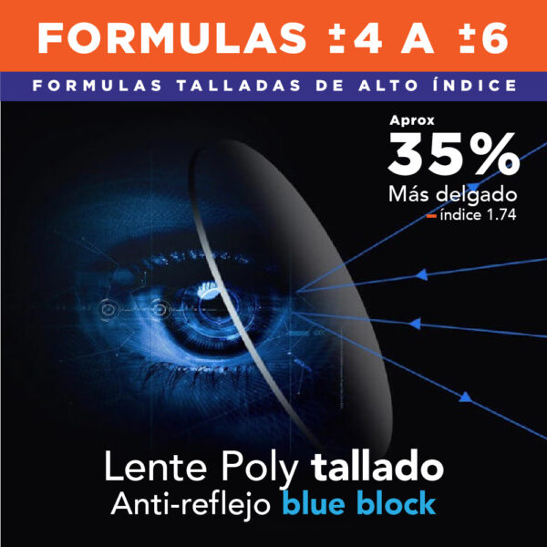 - Tiene un índice de 1.74, haciendo que el lente se vea hasta 35% más delgado. Mejorando la estética y anatomía de tu gafa.